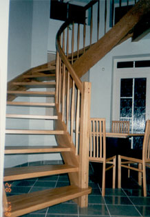 Správne riešené schodište musí byť predovšetkým pohodlné a bezpečné pri výstupe a zostupe, ľahko prístupné zo všetkých strán, ktoré ho obklopujú. Musí byť úsporne navrhnuté a tiež dobre osvetlené a vetrané. Musí sa ľahko udržiavať, vyhovovať po statickej stránke a odolávať opotrebeniu. Naše schody maximálne využívajú Váš priestor. Základný materiálom je buková a dubová škárovka dĺžkovo napájaná a priebežka, pri buku i parená . Možnosť povrchovej úpravy na požadovaný odtieň. Ohýbané prvky sa vyrábajú lepením tenkých vrstiev za studena ( preglejka, lamely, dýhy atď.) na vyrobené kopyto požadovaného tvaru.
